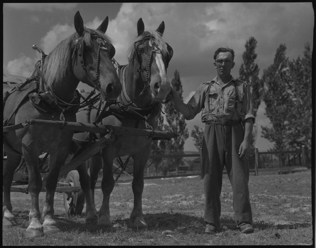 Firmin Veilleux et chevaux belges chez les Soeurs de la Charité. Saint-Côme, comté Beauce., 1952, Archives nationales à Québec, Fonds Ministère de la Culture et des Communications, (03Q,E6,S7,SS1,D2,P93968), Omer Beaudoin.