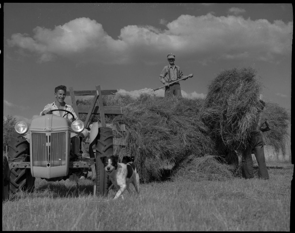 Scène des foins chez Honoré Courtemanche. Saint-Honoré-de-Shenley, comté Beauce., 1952, Archives nationales à Québec, Fonds Ministère de la Culture et des Communications, (03Q,E6,S7,SS1,D2,P93975), Omer Beaudoin.