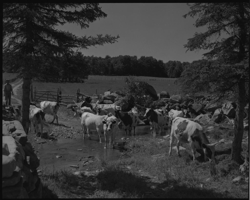 Troupeau s'abreuvant chez Henri Fecteau. Saint-Benoît-Labre, comté Beauce., 1952, Archives nationales à Québec, Fonds Ministère de la Culture et des Communications, (03Q,E6,S7,SS1,D2,P93987), Omer Beaudoin.