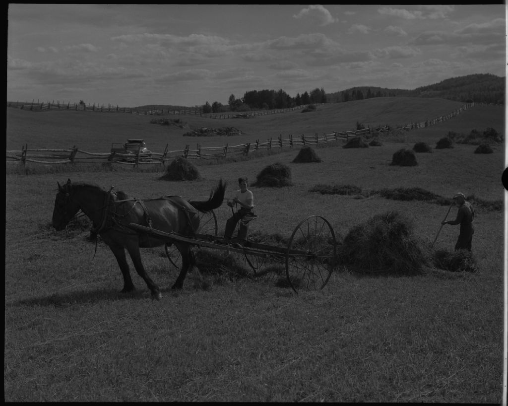 Scène de râtelage chez Auguste Dubé. Notre-Dame-du-Lac, comté Témiscouata., 1952, Archives nationales à Québec, Fonds Ministère de la Culture et des Communications, (03Q,E6,S7,SS1,D2,P94013), Omer Beaudoin.