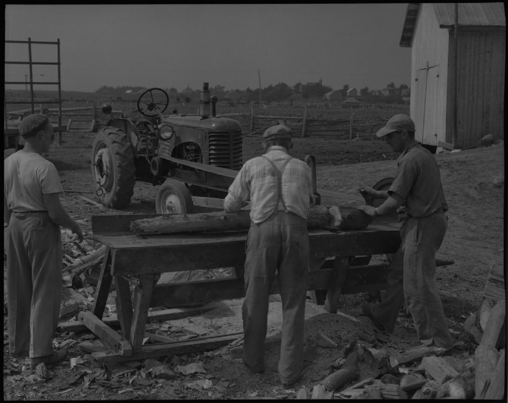 Coupage du bois à la scie ronde chez Alfred Michaud. Saint-Louis-de-Kamouraska.