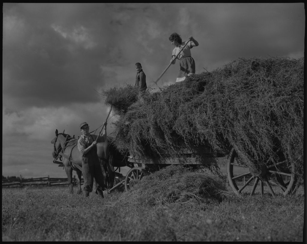 Chargement du foin chez Gaudias Biron. Saint-Agapit, comté Lotbinière., 1952, Archives nationales à Québec, Fonds Ministère de la Culture et des Communications, (03Q,E6,S7,SS1,D2,P94079), Omer Beaudoin.