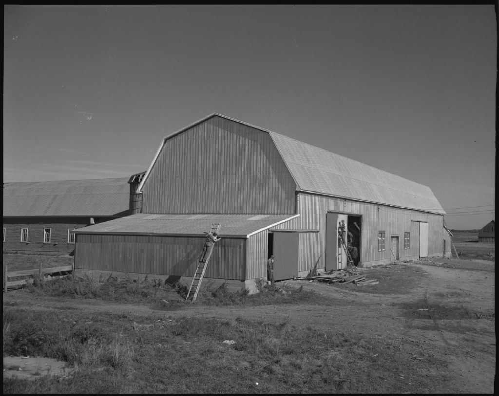 Grange-étable chez Auguste Boisclair. Sainte-Clothilde, comté Arthabaska., 1952, Archives nationales à Québec, Fonds Ministère de la Culture et des Communications, (03Q,E6,S7,SS1,D2,P94166), Omer Beaudoin.