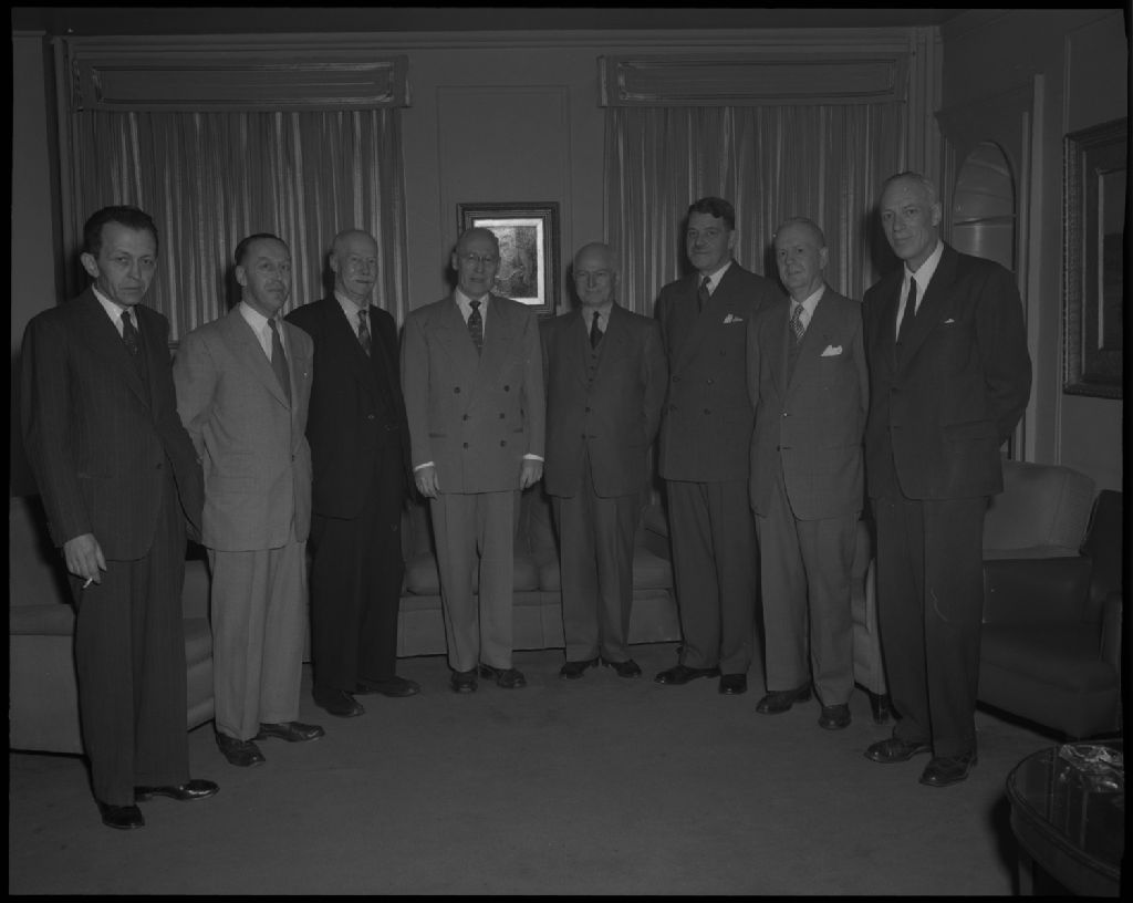 Réception au Cercle universitaire. De gauche à droite : Charles O. Beaudet, Yves Mercier, J.X. Mercier, Harry Ledden, A.O. Dufresne, Rober Samson, Geo. Massicotte, Yves Mercier. R.H. Taschereau, Québec