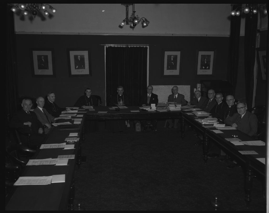 Séance des programmes et manuels. Monsieur Issalys, le docteur Gauthier, monseigneur Mélançon, monseigneur Roy, le cardinal Léger, monsieur B.O. Filteau, monsieur J.P. Labarre, monsieur McManus, monseigneur Frénette, monseigneur Smith et monsieur Coughlin