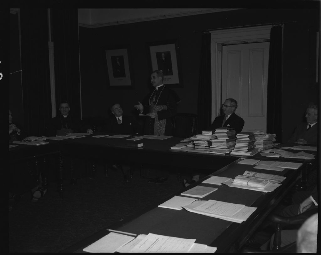 Séance de la Commission catholique. Monseigneur Roy , l'honorable Rivard, Son Éminence le cardinal Léger, monsieur Desaulniers et monsieur B.O. Filteau