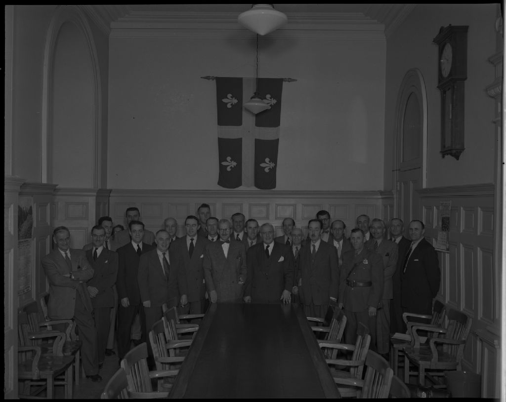 Chasse et Pêche, Assemblée des chefs de districts, service de la Protection de la Faune; au centre : l'honorable Camille-Eugène Pouliot, monsieur Roland English, S.M. Adjoint, monsieur Charles Frémont , surintendant général de la chasse et pêche