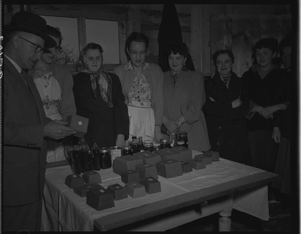 Groupe de producteurs de produits de l'érable de Petite-Rivière-Saint-François assistant à l'expertise de leurs produits exposés à la cabane à sucre de monsieur Gérard Lavoie