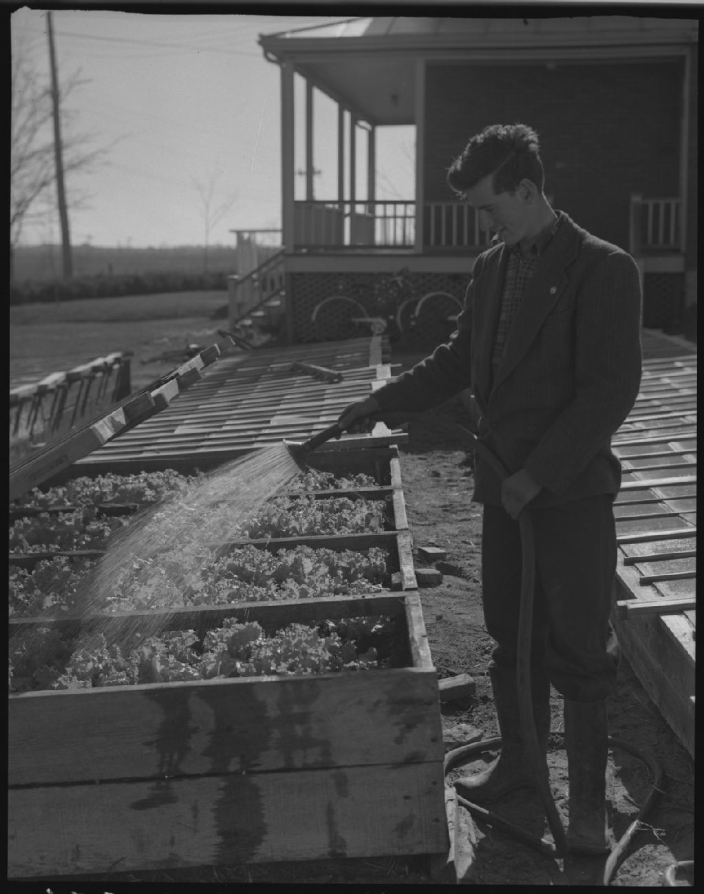 Chez monsieur David Drouin, maraicher de Beauport. Arrosage de la laitue en couches