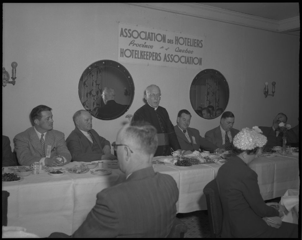 Congrès de l'Association des Hôteliers de la province de Québec. À la table d'honneur: monsieur J. Gobeil, Honorable W. L'Abbé, chanoine O. Grenier. Debout, messieurs B. Garon, Y. Jutras, maire et J. Morency. Victoriaville