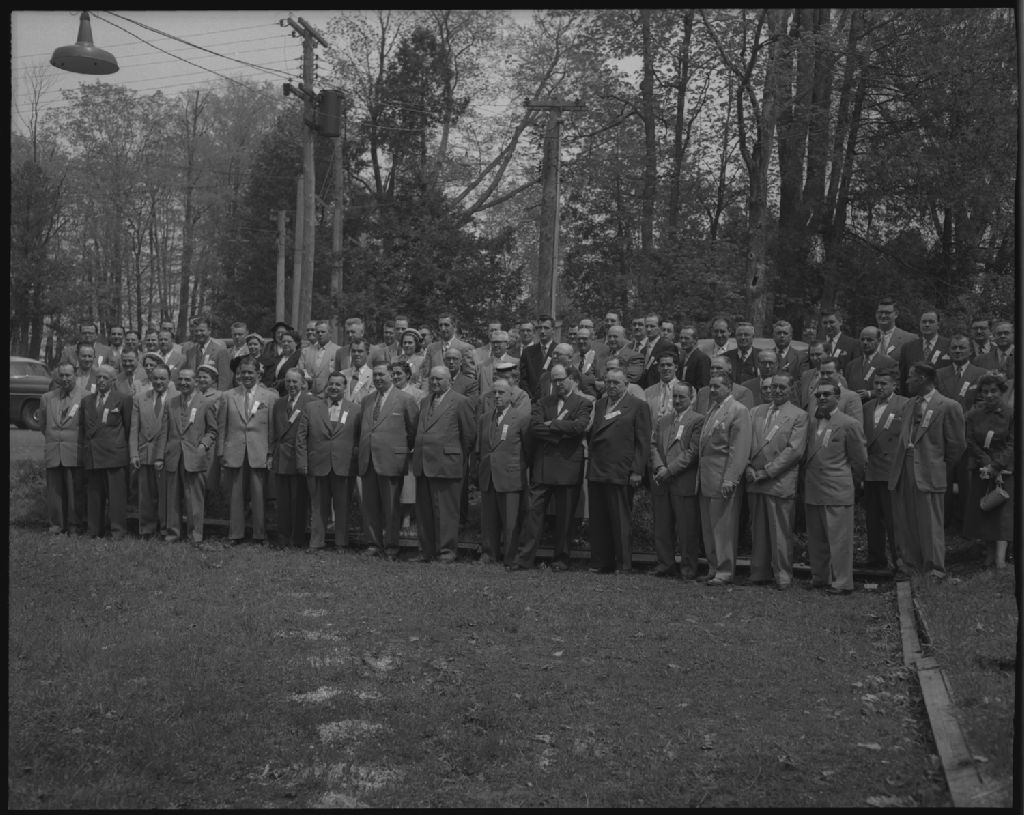 Congrès de l'Association des Hôteliers de la province de Québec. Groupe de congressistes au chalet "Des cêdres" à Victoriaville, 1953, Archives nationales à Québec, Fonds Ministère de la Culture et des Communications, (03Q,E6,S7,SS1,D2,P95248), Paul Carpentier.