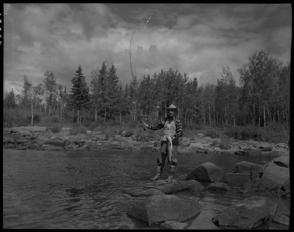Excursion de pêche de monsieur Eustache Marier et ses fils à la pêche à la ouananiche à Saint-Félicien, 1953, Archives nationales à Québec, Fonds Ministère de la Culture et des Communications, (03Q,E6,S7,SS1,D2,P96060), Gustave Bédard.