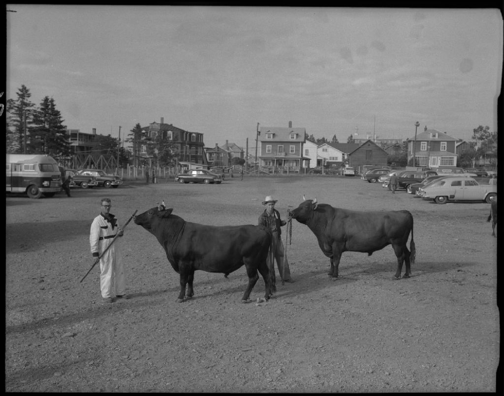 Catégorie des taureaux de la race canadienne à l'exposition régionale de Rimouski, propriétaires des animaux; Roland Bélanger de Saint-Ulric et Ludger Dubé de l'Isle-Verte, 1953, Archives nationales à Québec, Fonds Ministère de la Culture et des Communications, (03Q,E6,S7,SS1,D2,P96205), E.L. Désilets.