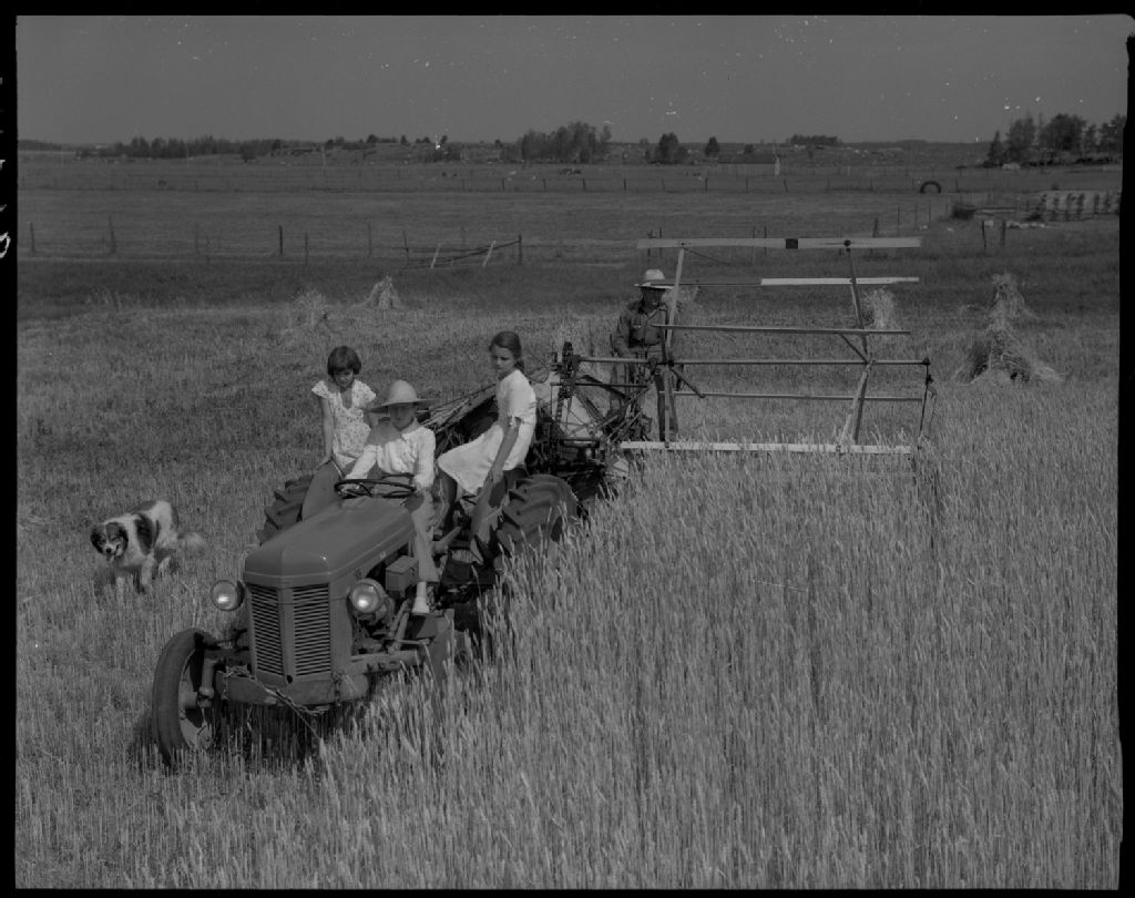 Récolte du blé sur la ferme de monsieur Jos. Trépanier à Médelec, comté de Témiscamingue, 1953, Archives nationales à Québec, Fonds Ministère de la Culture et des Communications, (03Q,E6,S7,SS1,D2,P96849), Omer Beaudoin.