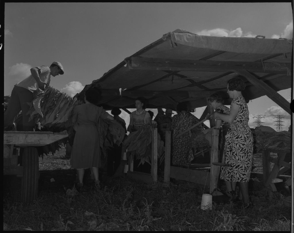 Attachage du tabac chez monsieur Étienne Harnois à Saint-Thomas, comté de Joliette, 1953, Archives nationales à Québec, Fonds Ministère de la Culture et des Communications, (03Q,E6,S7,SS1,D2,P96887), Omer Beaudoin.