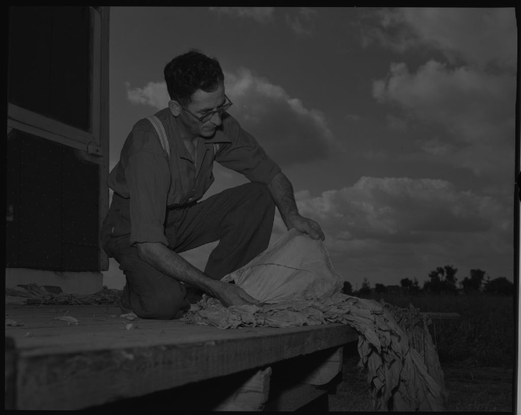 Monsieur Étienne Harnois inspecte le tabac à Saint-Thomas, comté de Joliette, 1953, Archives nationales à Québec, Fonds Ministère de la Culture et des Communications, (03Q,E6,S7,SS1,D2,P96889), Omer Beaudoin.