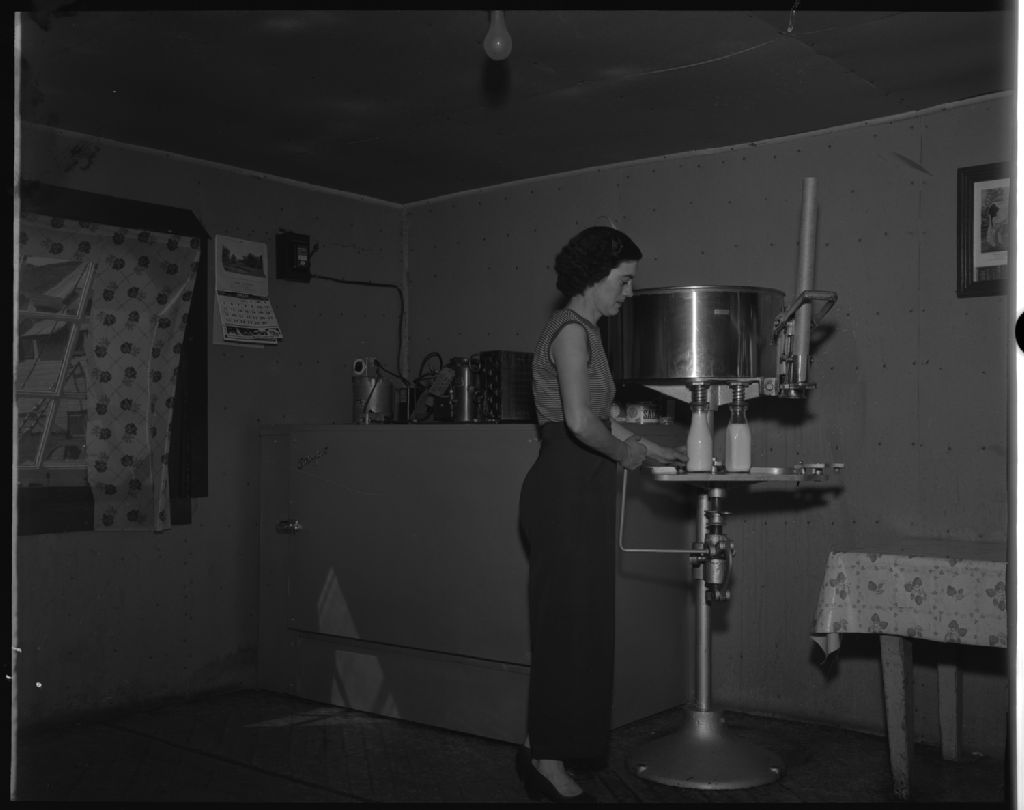 Monsieur Bernard Deschambault dans la laiterie à Val-Barrette, comté de Labelle, 1953, Archives nationales à Québec, Fonds Ministère de la Culture et des Communications, (03Q,E6,S7,SS1,D2,P97169), Omer Beaudoin.