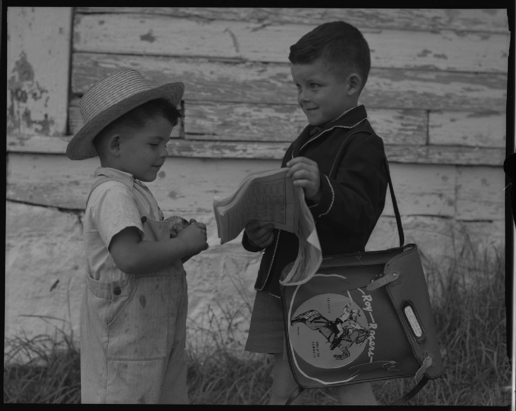 Jean-Claude montre à Roger son premier devoir chez monsieur Laurent Gingras à Saint-Gabriel-de-Brandon, comté de Berthier