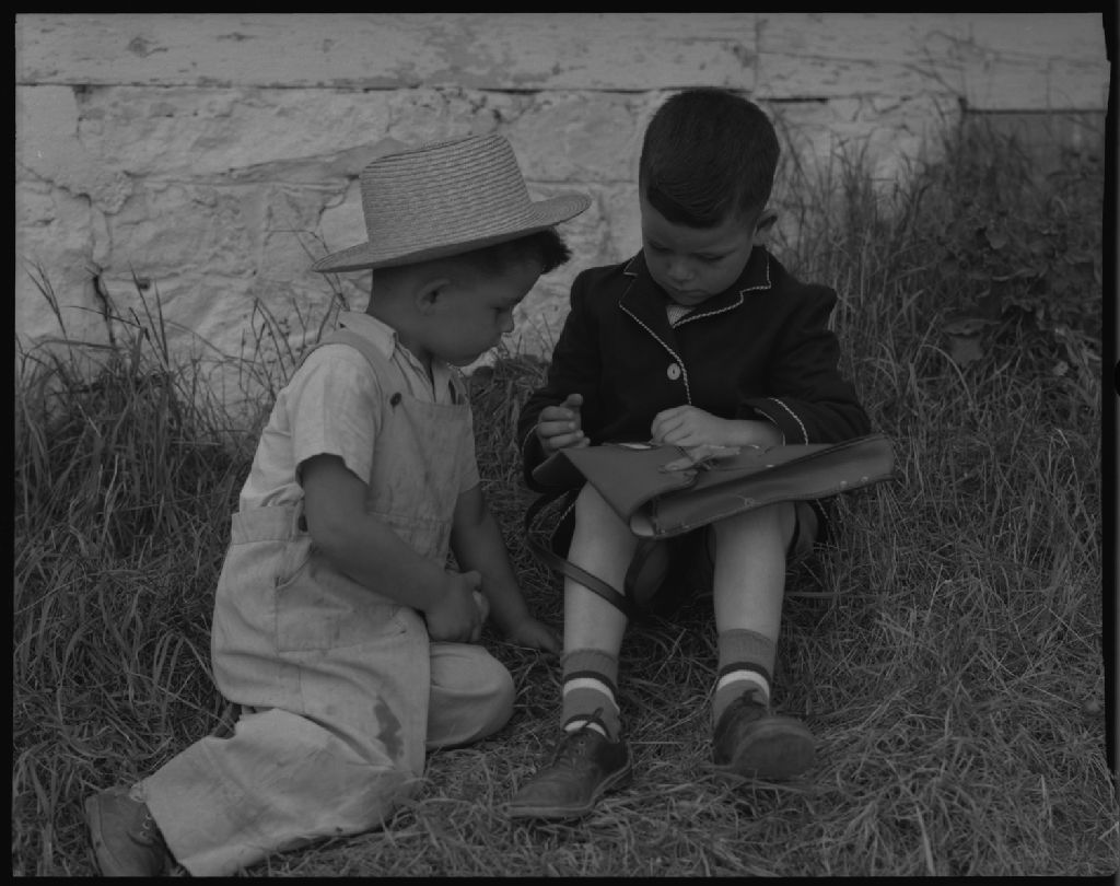 Jean-Claude montre à Roger son premier devoir chez monsieur Laurent Gingras à Saint-Gabriel-de-Brandon, comté de Berthier, 1953, Archives nationales à Québec, Fonds Ministère de la Culture et des Communications, (03Q,E6,S7,SS1,D2,P97223), Omer Beaudoin.
