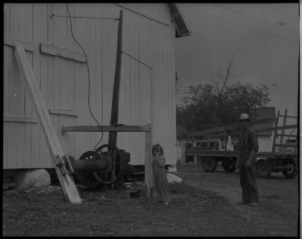 Treuil pour monter le foin au fenil chez monsieur Adrien Durocher à Saint-Gilbert, comté de Portneuf, 1953, Archives nationales à Québec, Fonds Ministère de la Culture et des Communications, (03Q,E6,S7,SS1,D2,P97262), Omer Beaudoin.