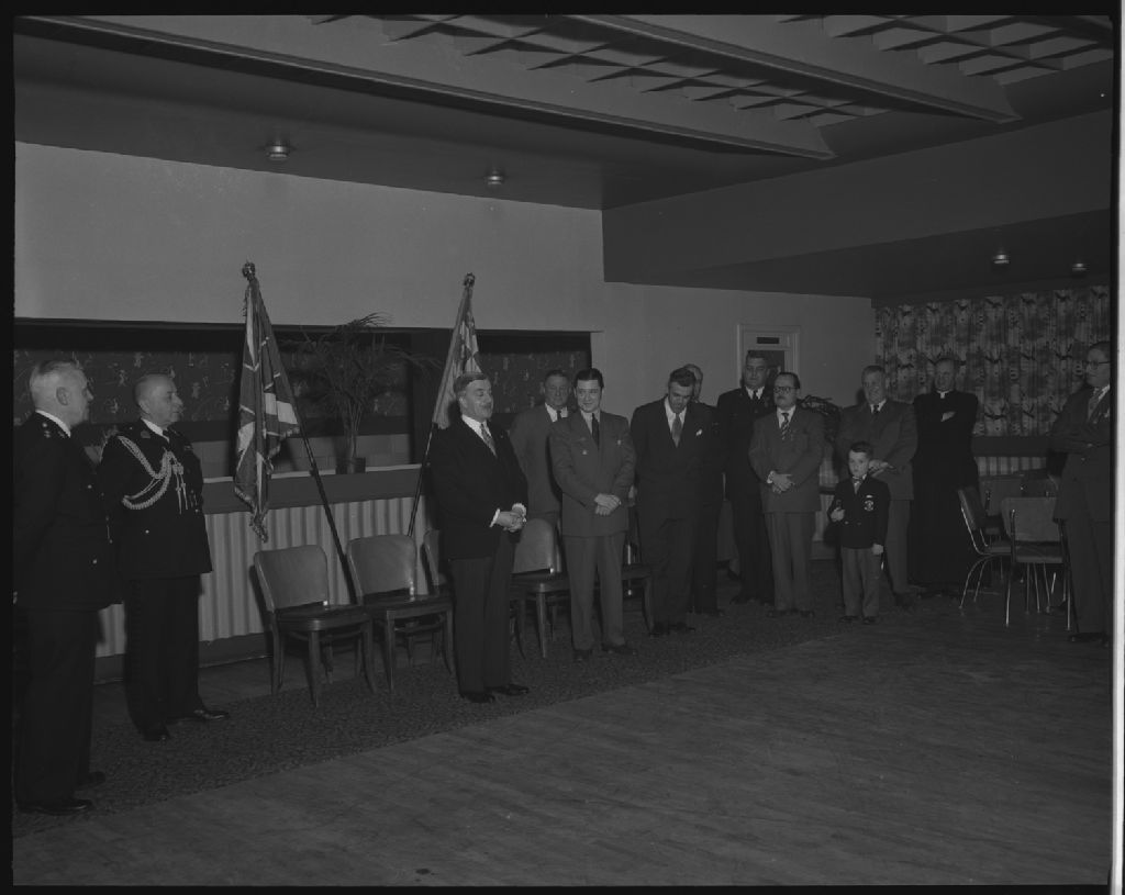 Ouverture par le lieutenant-gouverneur de la cérémonie de remise des médailles lors du couronnement. Chalet de l'Association des employés civils. Québec, 1954, Archives nationales à Québec, Fonds Ministère de la Culture et des Communications, (03Q,E6,S7,SS1,D2,P97905), Neuville Bazin.