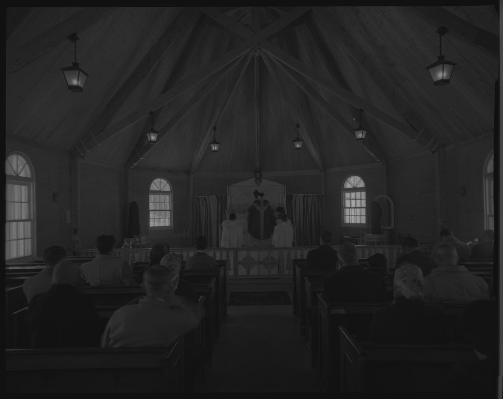 [Intérieur d'une église en bois], [1954?], Archives nationales à Québec, Fonds Ministère de la Culture et des Communications, (03Q,E6,S7,SS1,D2,P97967), Photographe non identifié.