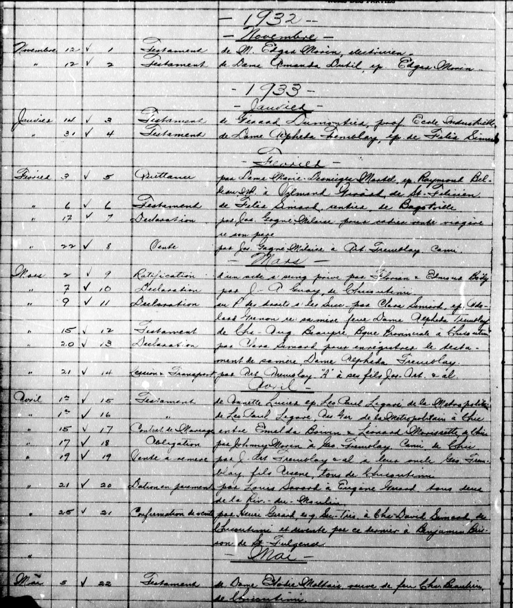 - Cette série regroupe les minutes notariales du greffe de Séraphin Perron, elle compte 431 pièces numérotées conservées dans des chemises numérotées et un répertoire pertinent.Prises dans leur ensemble, les données colligées dans ces documents officiels à contenu administratif et légal peuvent constituer une source documentaire des plus révélatrices sur le mode et les conditions de vie de la population pendant cette période (métiers et professions mentionnés aux contrats, inventaires de biens, testaments), sur les classes sociales (mention de titres correspondant au rang social des parties concernées tels bourgeois, écuyer, etc), sur les moeurs et coutumes acceptées par la société et ses institutions (par le biais de déclarations, de jugement arbitral, d'injonctions, d'ordonnances, etc), et, dans une proportion moindre, sur la médecine d'époque et ses représentants. Enfin, la terminologie utilisée dans ces contrats notariés pourrait [...]