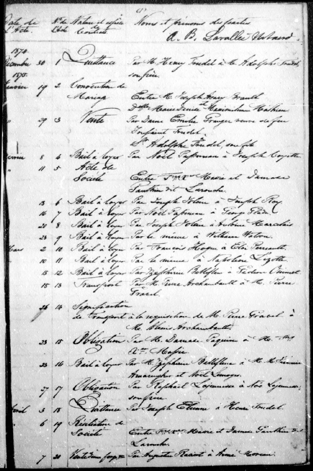 André Bouchard dit Lavallée, 1874-1877, Archives nationales à Montréal, Fonds Cour supérieure. District judiciaire de Montréal. Greffes de notaires, (06M,CN601,S244).