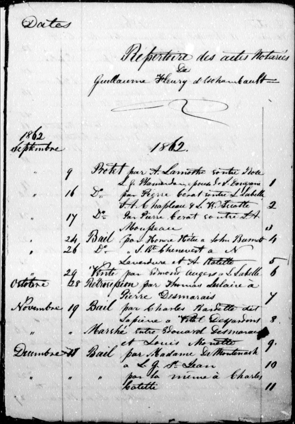 Guillaume Fleury-Deschambault, 1862-1864, Archives nationales à Montréal, Fonds Cour supérieure. District judiciaire de Montréal. Greffes de notaires, (06M,CN601,S155).