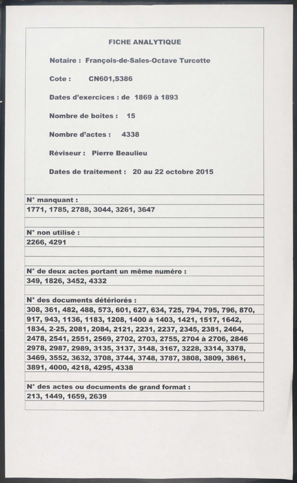François-de-Sales-Octave Turcotte, 1869-1893, Archives nationales à Montréal, Fonds Cour supérieure. District judiciaire de Montréal. Greffes de notaires, (06M,CN601,S386).