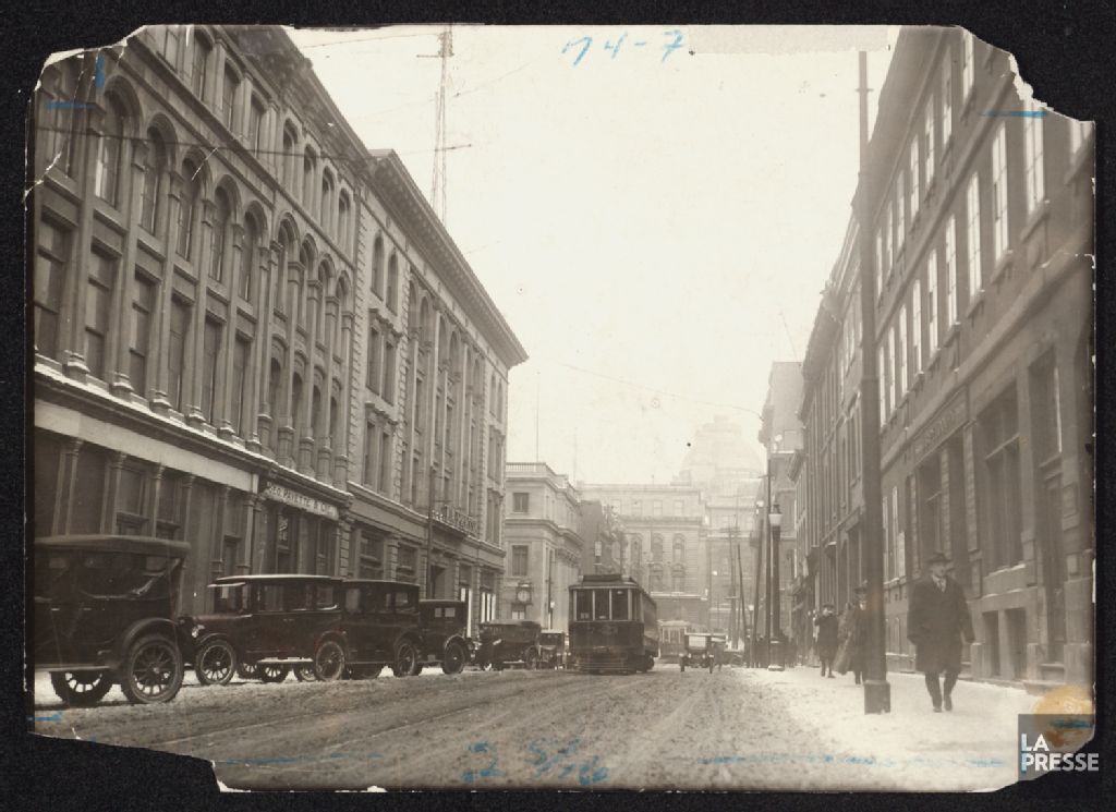 - Le dossier illustre la façade et l'entrée principale de l'édifice de La Presse sur la rue Saint-Jacques. Des documents montrent des passants devant l'édifice suite au décès du pape Léon XIII et une foule attendant les résultats d'un scrutin. Finalement, des documents montrent le thermo-baromètre à l'entrée et la levée d'un drapeau sur la toiture du bâtiment