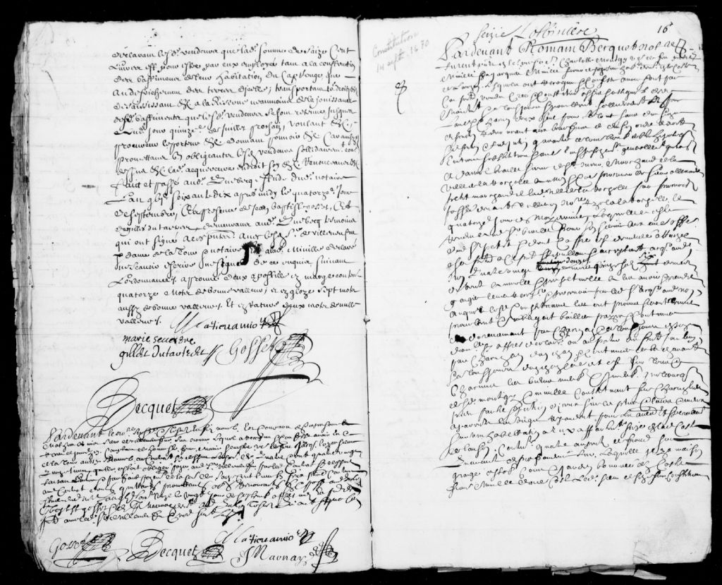 - Romain Becquet a pratiqué le notariat à Québec du [21 décembre] 1665 au 5 mars 1682Avertissement: Le greffe de Romain Becquet comporte des minutes séparées et des cahiers. Or, puisque les minutes séparées et les cahiers recoupent souvent les mêmes périodes de temps, il peut être difficile de repérer la section où se trouve un acte. À cet effet, vous pouvez utiliser les volumes 2 et 3 de l'Inventaire des greffes des notaires du régime français de Pierre-Georges Roy et l'index onomastique des volumes 1 à 8 de cette collection afin de localiser dans quel cahier ou dans quelle séquence de minutes séparées se retrouve le document désiré. Enfin, pour faciliter la tâche de repérage dans BAnQ numérique, nous avons indiqué ci-dessous l'ordre des cahiers et des minutes séparées:15 mai 1662 au 12 novembre 1666 ¿ Minutes séparées nos 1 à 227 (Dans BAnQ numérique, images 1 à 666 dans les actes du 21 décembre 1665 - 9 février 1670)22 août 1667 et 13 septembre 1667 ¿ Minutes séparées nos 228 et 229 (Dans BAnQ numérique, images 667 à 682 dans les actes du 21 décembre 1665 - 9 février 1670)2 octobre 1667 au 9 février 1670 ¿ Chemise no 230 : Cahier 1, 384 folios 229 (Dans BAnQ numérique, images 683 à 1081 dans les actes du 21 décembre 1665 - 9 février 1670)11 janvier 1668 au 14 février 1670 ¿ Minutes séparées nos 231 à 324 (Dans BAnQ numérique, images 1 à 283 dans les actes du 11 janvier 1668 - 13 avril 1671)22 février 1670 au 4 mai 1670 ¿ Chemise no 325: Cahier 2, 42 folios. A la fin du cahier se trouve un inventaire de marchandises et de dettes impliquant la famille Miville. (Dans BAnQ numérique, images 284 à 328 dans les actes du 11 janvier 1668 - 13 avril 1671)2 mars 1670 au 28 avril 1670 ¿ Minutes séparées nos 326 à 337 (Dans BAnQ numérique, images 329 à 397 dans les actes du 11 janvier 1668 - 13 avril 1671)2 mai 1670 au 31 août 1670 ¿ Chemise no 338: Cahier 3, 41 folios (Dans BAnQ numérique, images 398 à 444 dans les actes du 11 janvier 1668 - 13 avril 1671)19 mai 1670 au 30 décembre 1670 ¿ Minutes séparées nos 339 à 408 (Dans BAnQ numérique, images 445 à 655 dans les actes du 11 janvier 1668 - 13 avril 1671)20 août 1670 au 23 novembre 1670 ¿ Chemise no 409: Cahier 4, 132 folios (Dans BAnQ numérique, images 656 à 789 dans les actes du 11 janvier 1668 - 13 avril 1671)30 août 1670 au 5 octobre 1670 ¿ Chemise no 410: Cahier 5, 38 folios (Dans BAnQ numérique, images 790 à 829 dans les actes du 11 janvier 1668 - 13 avril 1671)6 octobre 1670 au 14 novembre 1670 ¿ Chemise no 411: Cahier 6, 47 folios (Dans BAnQ numérique, images 830 à 879 dans les actes du 11 janvier 1668 - 13 avril 1671)1 décembre 1670 au 13 avril 1671 ¿ Chemise no 412: Cahier 7, 40 folios (Dans BAnQ numérique, images 880 à 921 dans les actes du 11 janvier 1668 - 13 avril 1671)14 avril 1671 au 16 août 1671 ¿ Chemise no 413: Cahier 8, 48 folios (Dans BAnQ numérique, images 1 à 53 dans les actes du 14 avril 1671 - 31 octobre 1672)15 août 1671 au 26 octobre 1671 ¿ Chemise no 414: Cahier 9, 47 folios (Dans BAnQ numérique, images 54 à 105 dans les actes du 14 avril 1671 - 31 octobre 1672)7 octobre 1671 au 13 octobre 1671 ¿ Chemise no 415: Cahier 10, 44 folios (Dans BAnQ numérique, images 106 à 153 dans les actes du 14 avril 1671 - 31 octobre 1672)13 octobre 1671 au 29 octobre 1671 ¿ Chemise no 416: Cahier 11, 42 folios (Dans BAnQ numérique, images 154 à 197 dans les actes du 14 avril 1671 - 31 octobre 1672)20 octobre 1671 au 26 décembre 1671 ¿ Chemise no 417: Cahier 12, 28 folios (Dans BAnQ numérique, images 198 à 227 dans les actes du 14 avril 1671 - 31 octobre 1672)30 octobre 1671 au 24 avril 1672 ¿ Chemise no 418: Cahier 13, 30 folios (Dans BAnQ numérique, images 228 à 261 dans les actes du 14 avril 1671 - 31 octobre 1672)13 janvier 1671 au 3 janvier 1672 : Minutes séparées nos 419 à 504 (Dans BAnQ numérique, images 262 à 538 dans les actes du 14 avril 1671 - 31 octobre 1672)8 janvier 1672 au 22 septembre 1672 ¿ Chemise no 505: Cahier 14, 43 folios (Dans BAnQ numérique, images 539 à 597 dans les actes du 14 avril 1671 - 31 octobre 1672)3 janvier 1672 au 6 octobre 1672 ¿ Minutes séparées nos 506 à 585 (Dans BAnQ numérique, images 598 à 781 dans les actes du 14 avril 1671 - 31 octobre 1672)7 octobre 1672 au 18 décembre 1672 ¿ Chemise no 586: Cahier 15, 42 folios (Dans BAnQ numérique, images 782 à 828 dans les actes du 14 avril 1671 - 31 octobre 1672)9 octobre 1672 au 31 octobre 1672 ¿ Minutes séparées nos 587 à 605 (Dans BAnQ numérique, images 829 à 881 dans les actes du 14 avril 1671 - 31 octobre 1672)1 novembre 1672 au 29 décembre 1672 ¿ Minutes séparées nos 606 à 638 (Dans BAnQ numérique, images 1 à 101 dans les actes du 1 novembre 1672 - 21 août 1675)2 janvier 1673 au 5 juin 1673 ¿ Chemise no 639: Cahier 16, 39 folios (Dans BAnQ numérique, images 102 à 143 dans les actes du 1 novembre 1672 - 21 août 1675)4 janvier 1673 au 3 juin 1673 ¿ Minutes séparées nos 640 à 664 (Dans BAnQ numérique, images 144 à 227 dans les actes du 1 novembre 1672 - 21 août 1675)8 juin 1673 au 4 octobre 1673 ¿ Chemise no 665: Cahier 17, 46 folios (Dans BAnQ numérique, images 228 à 277 dans les actes du 1 novembre 1672 - 21 août 1675)11 juin 1673 au 3 septembre 1673 ¿ Minutes séparées nos 666 à 679 (Dans BAnQ numérique, images 278 à 330 dans les actes du 1 novembre 1672 - 21 août 1675)6 septembre 1673 au 17 octobre 1673 ¿ Chemise no 680: Cahier 18, 41 folios (Dans BAnQ numérique, images 331 à 372 dans les actes du 1 novembre 1672 - 21 août 1675)9 septembre 1673 au 15 octobre 1674 ¿ Minutes séparées nos 681 à 691 (Dans BAnQ numérique, images 373 à 413 dans les actes du 1 novembre 1672 - 21 août 1675)16 octobre 1673 au 11 mars 1674 ¿ Chemise no 692: Cahier 19, 40 folios (Dans BAnQ numérique, images 414 à 457 dans les actes du 1 novembre 1672 - 21 août 1675)23 octobre 1673 au 4 mars 1674 