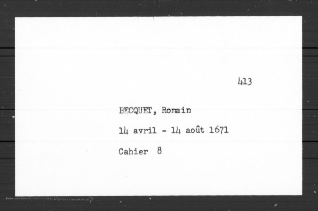 - Romain Becquet a pratiqué le notariat à Québec du [21 décembre] 1665 au 5 mars 1682Avertissement: Le greffe de Romain Becquet comporte des minutes séparées et des cahiers. Or, puisque les minutes séparées et les cahiers recoupent souvent les mêmes périodes de temps, il peut être difficile de repérer la section où se trouve un acte. À cet effet, vous pouvez utiliser les volumes 2 et 3 de l'Inventaire des greffes des notaires du régime français de Pierre-Georges Roy et l'index onomastique des volumes 1 à 8 de cette collection afin de localiser dans quel cahier ou dans quelle séquence de minutes séparées se retrouve le document désiré. Enfin, pour faciliter la tâche de repérage dans BAnQ numérique, nous avons indiqué ci-dessous l'ordre des cahiers et des minutes séparées:15 mai 1662 au 12 novembre 1666 ¿ Minutes séparées nos 1 à 227 (Dans BAnQ numérique, images 1 à 666 dans les actes du 21 décembre 1665 - 9 février 1670)22 août 1667 et 13 septembre 1667 ¿ Minutes séparées nos 228 et 229 (Dans BAnQ numérique, images 667 à 682 dans les actes du 21 décembre 1665 - 9 février 1670)2 octobre 1667 au 9 février 1670 ¿ Chemise no 230 : Cahier 1, 384 folios 229 (Dans BAnQ numérique, images 683 à 1081 dans les actes du 21 décembre 1665 - 9 février 1670)11 janvier 1668 au 14 février 1670 ¿ Minutes séparées nos 231 à 324 (Dans BAnQ numérique, images 1 à 283 dans les actes du 11 janvier 1668 - 13 avril 1671)22 février 1670 au 4 mai 1670 ¿ Chemise no 325: Cahier 2, 42 folios. A la fin du cahier se trouve un inventaire de marchandises et de dettes impliquant la famille Miville. (Dans BAnQ numérique, images 284 à 328 dans les actes du 11 janvier 1668 - 13 avril 1671)2 mars 1670 au 28 avril 1670 ¿ Minutes séparées nos 326 à 337 (Dans BAnQ numérique, images 329 à 397 dans les actes du 11 janvier 1668 - 13 avril 1671)2 mai 1670 au 31 août 1670 ¿ Chemise no 338: Cahier 3, 41 folios (Dans BAnQ numérique, images 398 à 444 dans les actes du 11 janvier 1668 - 13 avril 1671)19 mai 1670 au 30 décembre 1670 ¿ Minutes séparées nos 339 à 408 (Dans BAnQ numérique, images 445 à 655 dans les actes du 11 janvier 1668 - 13 avril 1671)20 août 1670 au 23 novembre 1670 ¿ Chemise no 409: Cahier 4, 132 folios (Dans BAnQ numérique, images 656 à 789 dans les actes du 11 janvier 1668 - 13 avril 1671)30 août 1670 au 5 octobre 1670 ¿ Chemise no 410: Cahier 5, 38 folios (Dans BAnQ numérique, images 790 à 829 dans les actes du 11 janvier 1668 - 13 avril 1671)6 octobre 1670 au 14 novembre 1670 ¿ Chemise no 411: Cahier 6, 47 folios (Dans BAnQ numérique, images 830 à 879 dans les actes du 11 janvier 1668 - 13 avril 1671)1 décembre 1670 au 13 avril 1671 ¿ Chemise no 412: Cahier 7, 40 folios (Dans BAnQ numérique, images 880 à 921 dans les actes du 11 janvier 1668 - 13 avril 1671)14 avril 1671 au 16 août 1671 ¿ Chemise no 413: Cahier 8, 48 folios (Dans BAnQ numérique, images 1 à 53 dans les actes du 14 avril 1671 - 31 octobre 1672)15 août 1671 au 26 octobre 1671 ¿ Chemise no 414: Cahier 9, 47 folios (Dans BAnQ numérique, images 54 à 105 dans les actes du 14 avril 1671 - 31 octobre 1672)7 octobre 1671 au 13 octobre 1671 ¿ Chemise no 415: Cahier 10, 44 folios (Dans BAnQ numérique, images 106 à 153 dans les actes du 14 avril 1671 - 31 octobre 1672)13 octobre 1671 au 29 octobre 1671 ¿ Chemise no 416: Cahier 11, 42 folios (Dans BAnQ numérique, images 154 à 197 dans les actes du 14 avril 1671 - 31 octobre 1672)20 octobre 1671 au 26 décembre 1671 ¿ Chemise no 417: Cahier 12, 28 folios (Dans BAnQ numérique, images 198 à 227 dans les actes du 14 avril 1671 - 31 octobre 1672)30 octobre 1671 au 24 avril 1672 ¿ Chemise no 418: Cahier 13, 30 folios (Dans BAnQ numérique, images 228 à 261 dans les actes du 14 avril 1671 - 31 octobre 1672)13 janvier 1671 au 3 janvier 1672 : Minutes séparées nos 419 à 504 (Dans BAnQ numérique, images 262 à 538 dans les actes du 14 avril 1671 - 31 octobre 1672)8 janvier 1672 au 22 septembre 1672 ¿ Chemise no 505: Cahier 14, 43 folios (Dans BAnQ numérique, images 539 à 597 dans les actes du 14 avril 1671 - 31 octobre 1672)3 janvier 1672 au 6 octobre 1672 ¿ Minutes séparées nos 506 à 585 (Dans BAnQ numérique, images 598 à 781 dans les actes du 14 avril 1671 - 31 octobre 1672)7 octobre 1672 au 18 décembre 1672 ¿ Chemise no 586: Cahier 15, 42 folios (Dans BAnQ numérique, images 782 à 828 dans les actes du 14 avril 1671 - 31 octobre 1672)9 octobre 1672 au 31 octobre 1672 ¿ Minutes séparées nos 587 à 605 (Dans BAnQ numérique, images 829 à 881 dans les actes du 14 avril 1671 - 31 octobre 1672)1 novembre 1672 au 29 décembre 1672 ¿ Minutes séparées nos 606 à 638 (Dans BAnQ numérique, images 1 à 101 dans les actes du 1 novembre 1672 - 21 août 1675)2 janvier 1673 au 5 juin 1673 ¿ Chemise no 639: Cahier 16, 39 folios (Dans BAnQ numérique, images 102 à 143 dans les actes du 1 novembre 1672 - 21 août 1675)4 janvier 1673 au 3 juin 1673 ¿ Minutes séparées nos 640 à 664 (Dans BAnQ numérique, images 144 à 227 dans les actes du 1 novembre 1672 - 21 août 1675)8 juin 1673 au 4 octobre 1673 ¿ Chemise no 665: Cahier 17, 46 folios (Dans BAnQ numérique, images 228 à 277 dans les actes du 1 novembre 1672 - 21 août 1675)11 juin 1673 au 3 septembre 1673 ¿ Minutes séparées nos 666 à 679 (Dans BAnQ numérique, images 278 à 330 dans les actes du 1 novembre 1672 - 21 août 1675)6 septembre 1673 au 17 octobre 1673 ¿ Chemise no 680: Cahier 18, 41 folios (Dans BAnQ numérique, images 331 à 372 dans les actes du 1 novembre 1672 - 21 août 1675)9 septembre 1673 au 15 octobre 1674 ¿ Minutes séparées nos 681 à 691 (Dans BAnQ numérique, images 373 à 413 dans les actes du 1 novembre 1672 - 21 août 1675)16 octobre 1673 au 11 mars 1674 ¿ Chemise no 692: Cahier 19, 40 folios (Dans BAnQ numérique, images 414 à 457 dans les actes du 1 novembre 1672 - 21 août 1675)23 octobre 1673 au 4 mars 1674 