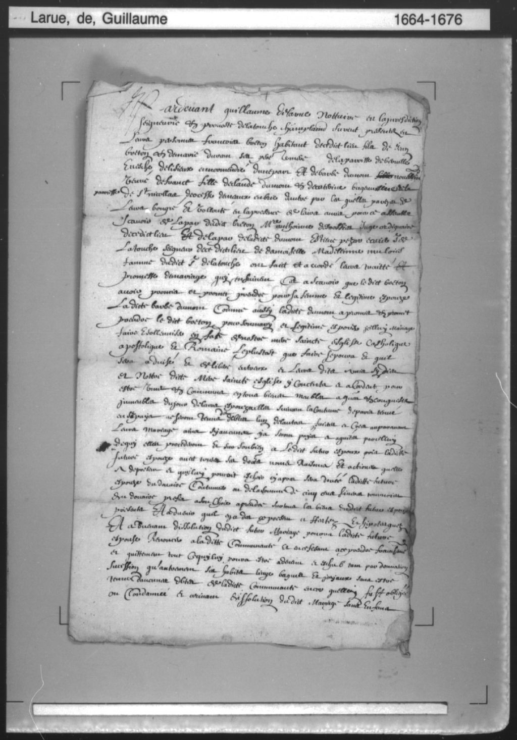 - Cette série regroupe 136 minutes notariales du greffe de Guillaume de Larue ainsi qu'un répertoire chronologique et un répertoire thématique. De 1664 à 1676, le notaire Larue a exercé à Champlain du (9 janvier 1664 au 18 août 1676).Prises dans leur ensemble, les données colligées dans ces documents officiels à contenu administratif et légal peuvent constituer une source documentaire des plus révélatrices sur le mode et les conditions de vie de la population pendant cette période (métiers et professions mentionnés aux contrats, inventaires de biens, testaments), sur les classes sociales (mention de titres correspondant au rang social des parties concernées tels bourgeois, écuyer, etc), sur les moeurs et coutumes acceptées par la société et ses institutions (par le biais de déclarations, de jugement arbitral, d'injonctions, d'ordonnances, etc), et, dans une proportion moindre, sur la médecine d'époque et ses représentants.Enfin, la terminologie utilisée dans ces contrats notariés pourrait être avantageusement récupérée dans le cadre d'études portant sur l'évolution du langage administratif et légal, voire même sur l'évolution de la langue française