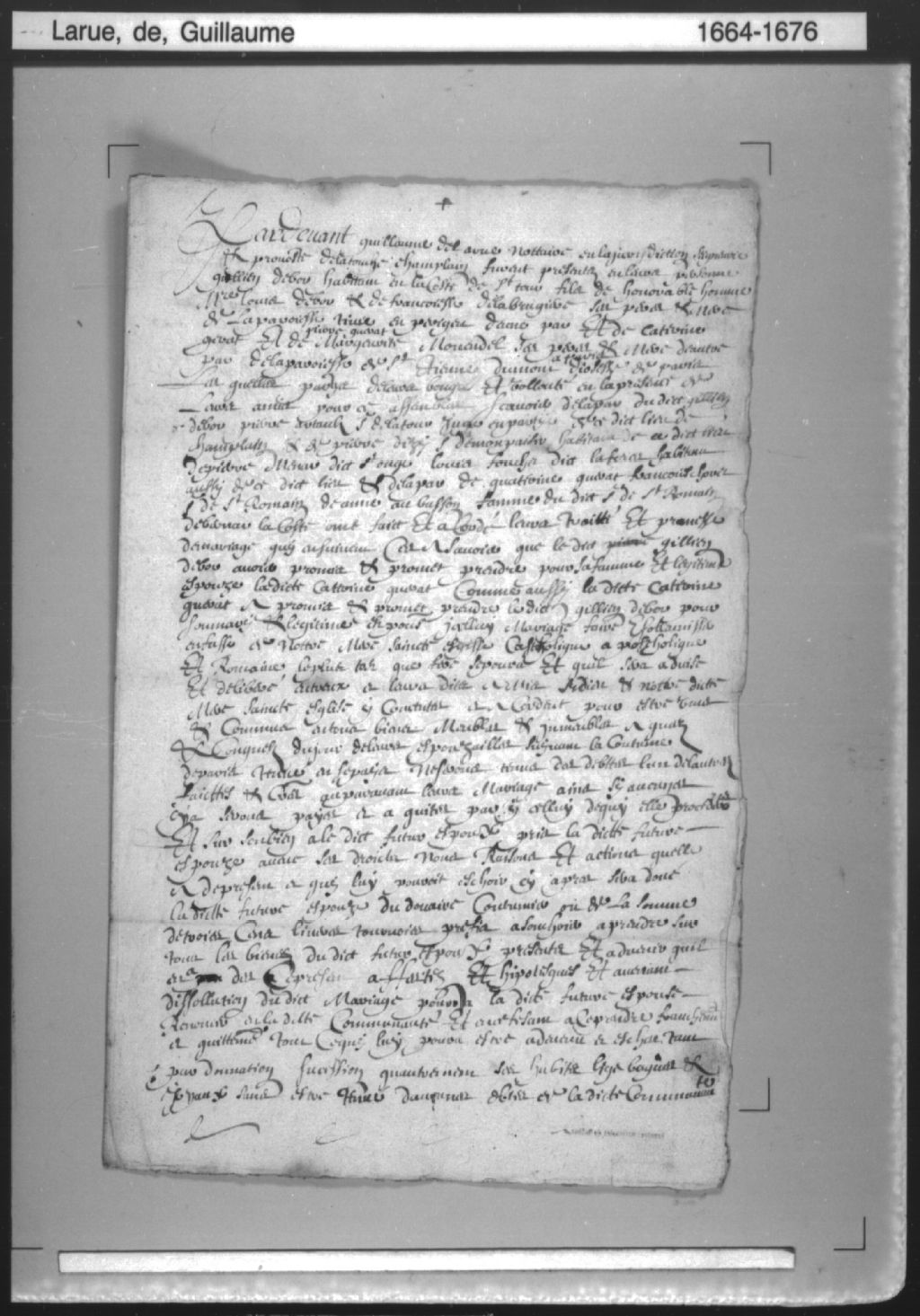 - Cette série regroupe 136 minutes notariales du greffe de Guillaume de Larue ainsi qu'un répertoire chronologique et un répertoire thématique. De 1664 à 1676, le notaire Larue a exercé à Champlain du (9 janvier 1664 au 18 août 1676).Prises dans leur ensemble, les données colligées dans ces documents officiels à contenu administratif et légal peuvent constituer une source documentaire des plus révélatrices sur le mode et les conditions de vie de la population pendant cette période (métiers et professions mentionnés aux contrats, inventaires de biens, testaments), sur les classes sociales (mention de titres correspondant au rang social des parties concernées tels bourgeois, écuyer, etc), sur les moeurs et coutumes acceptées par la société et ses institutions (par le biais de déclarations, de jugement arbitral, d'injonctions, d'ordonnances, etc), et, dans une proportion moindre, sur la médecine d'époque et ses représentants.Enfin, la terminologie utilisée dans ces contrats notariés pourrait être avantageusement récupérée dans le cadre d'études portant sur l'évolution du langage administratif et légal, voire même sur l'évolution de la langue française