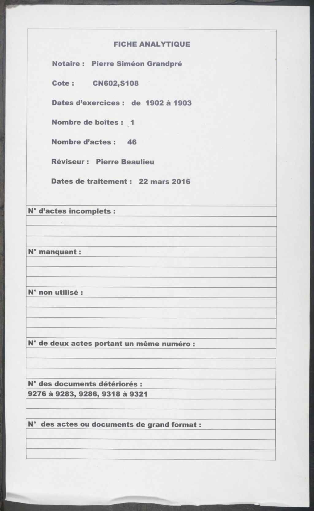 Pierre Siméon Grandpré, 1902-1903, Archives nationales à Montréal, Fonds Cour supérieure. District judiciaire de Saint-Hyacinthe. Greffes de notaires, (06M,CN602,S108).