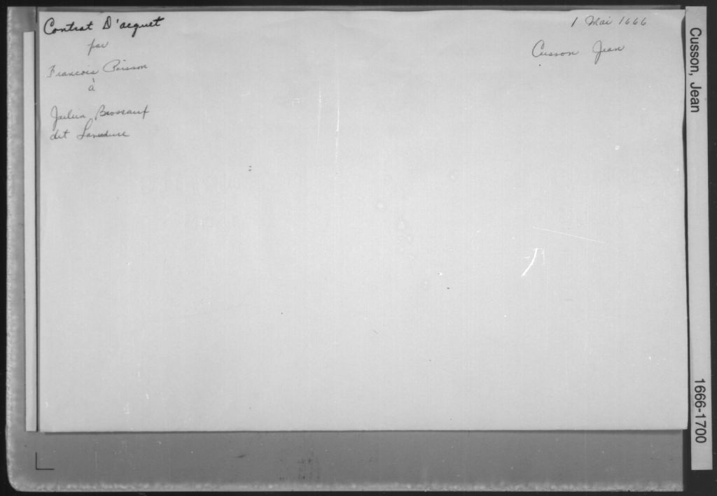 - Cette série regroupe 489 minutes notariales du greffe de Jean Cusson ainsi qu'un répertoire chronologique. De 1666 à 1700, le notaire Cusson a exercé à Cap-de-la-Madeleine (du 1 mai 1666 au 3 mai 1700).Prises dans leur ensemble, les données colligées dans ces documents officiels à contenu administratif et légal peuvent constituer une source documentaire des plus révélatrices sur le mode et les conditions de vie de la population pendant cette période (métiers et professions mentionnés aux contrats, inventaires de biens, testaments), sur les classes sociales (mention de titres correspondant au rang social des parties concernées tels bourgeois, écuyer, etc), sur les moeurs et coutumes acceptées par la société et ses institutions (par le biais de déclarations, de jugement arbitral, d'injonctions, d'ordonnances, etc), et, dans une proportion moindre, sur la médecine d'époque et ses représentants.Enfin, la terminologie utilisée dans ces contrats notariés pourrait être avantageusement récupérée dans le cadre d'études portant sur l'évolution du langage administratif et légal, voire même sur l'évolution de la langue française