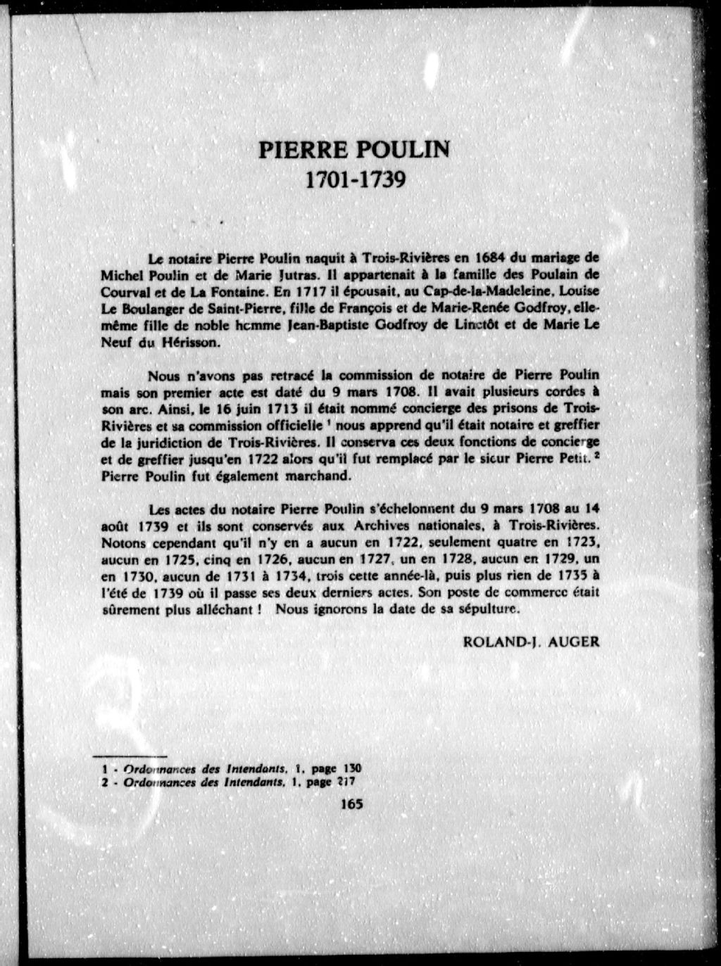 - Cette série regroupe 273 minutes notariales du greffe de Pierre Poulin ainsi que deux répertoires thématiques. Il n'y a aucun acte en 1710, 1722, 1725, 1727, 1729, 1735, 1736, 1737 et 1738. De 1708 à 1739, le notaire Poulin a exercé à Trois-Rivières (du 9 mars 1708 au 14 août 1739).Prises dans leur ensemble, les données colligées dans ces documents officiels à contenu administratif et légal peuvent constituer une source documentaire des plus révélatrices sur le mode et les conditions de vie de la population pendant cette période (métiers et professions mentionnés aux contrats, inventaires de biens, testaments), sur les classes sociales (mention de titres correspondant au rang social des parties concernées tels bourgeois, écuyer, etc), sur les moeurs et coutumes acceptées par la société et ses institutions (par le biais de déclarations, de jugement arbitral, d'injonctions, d'ordonnances, etc), et, dans une proportion moindre, sur la [...]