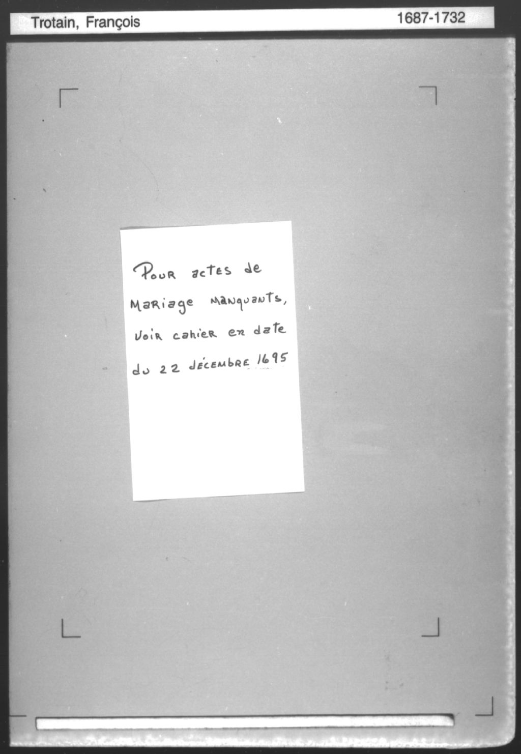 Cette série regroupe 646 minutes notariales du greffe de François Trottain dit Saint-Seürin ainsi qu'un répertoire chronologique. Une des pièces est un cahier contenant les contrats de mariage du 22 décembre 1695 au 31 janvier 1704. De 1687 à 1731 le notaire Trottain a exercé à Batiscan (du 9 mars 1687 au 19 janvier 1731).Prises dans leur ensemble, les données colligées dans ces documents officiels à contenu administratif et légal peuvent constituer une source documentaire des plus révélatrices sur le mode et les conditions de vie de la population pendant cette période (métiers et professions mentionnés aux contrats, inventaires de biens, testaments), sur les classes sociales (mention de titres correspondant au rang social des parties concernées tels bourgeois, écuyer, etc), sur les moeurs et coutumes acceptées par la société et ses institutions (par le biais de déclarations, de jugement arbitral, d'injonctions, d'ordonnances, etc), et [...]