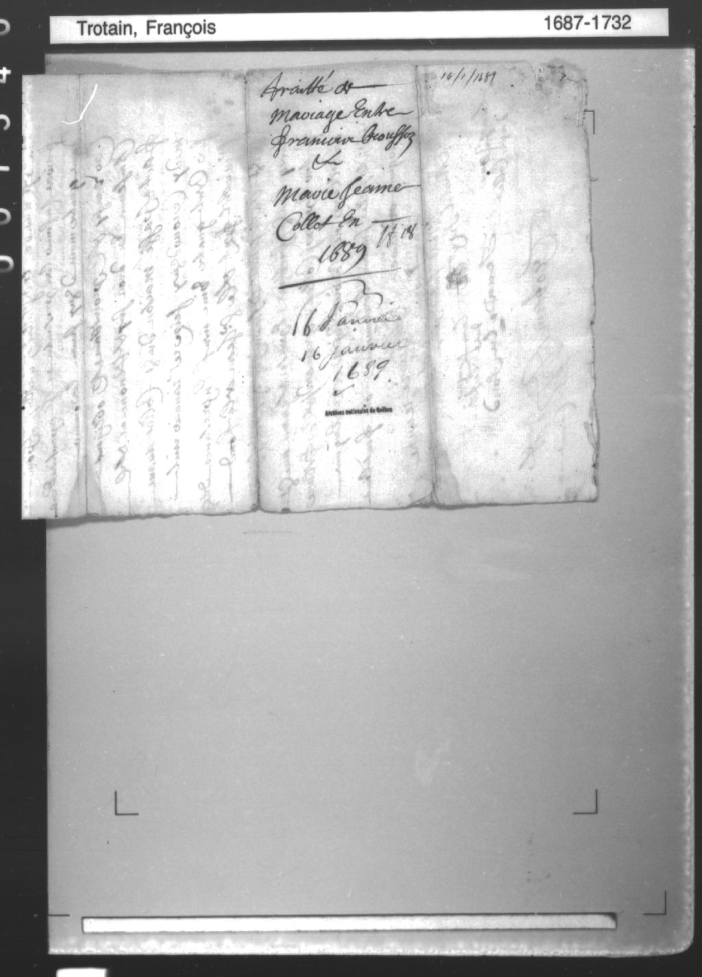 - Cette série regroupe 646 minutes notariales du greffe de François Trottain dit Saint-Seürin ainsi qu'un répertoire chronologique. Une des pièces est un cahier contenant les contrats de mariage du 22 décembre 1695 au 31 janvier 1704. De 1687 à 1731 le notaire Trottain a exercé à Batiscan (du 9 mars 1687 au 19 janvier 1731).Prises dans leur ensemble, les données colligées dans ces documents officiels à contenu administratif et légal peuvent constituer une source documentaire des plus révélatrices sur le mode et les conditions de vie de la population pendant cette période (métiers et professions mentionnés aux contrats, inventaires de biens, testaments), sur les classes sociales (mention de titres correspondant au rang social des parties concernées tels bourgeois, écuyer, etc), sur les moeurs et coutumes acceptées par la société et ses institutions (par le biais de déclarations, de jugement arbitral, d'injonctions, d'ordonnances, etc), et, dans une proportion moindre, sur la médecine d'époque et ses représentants.Enfin, la terminologie utilisée dans ces contrats notariés pourrait être avantageusement récupérée dans le cadre d'études portant sur l'évolution du langage administratif et légal, voire même sur l'évolution de la langue française