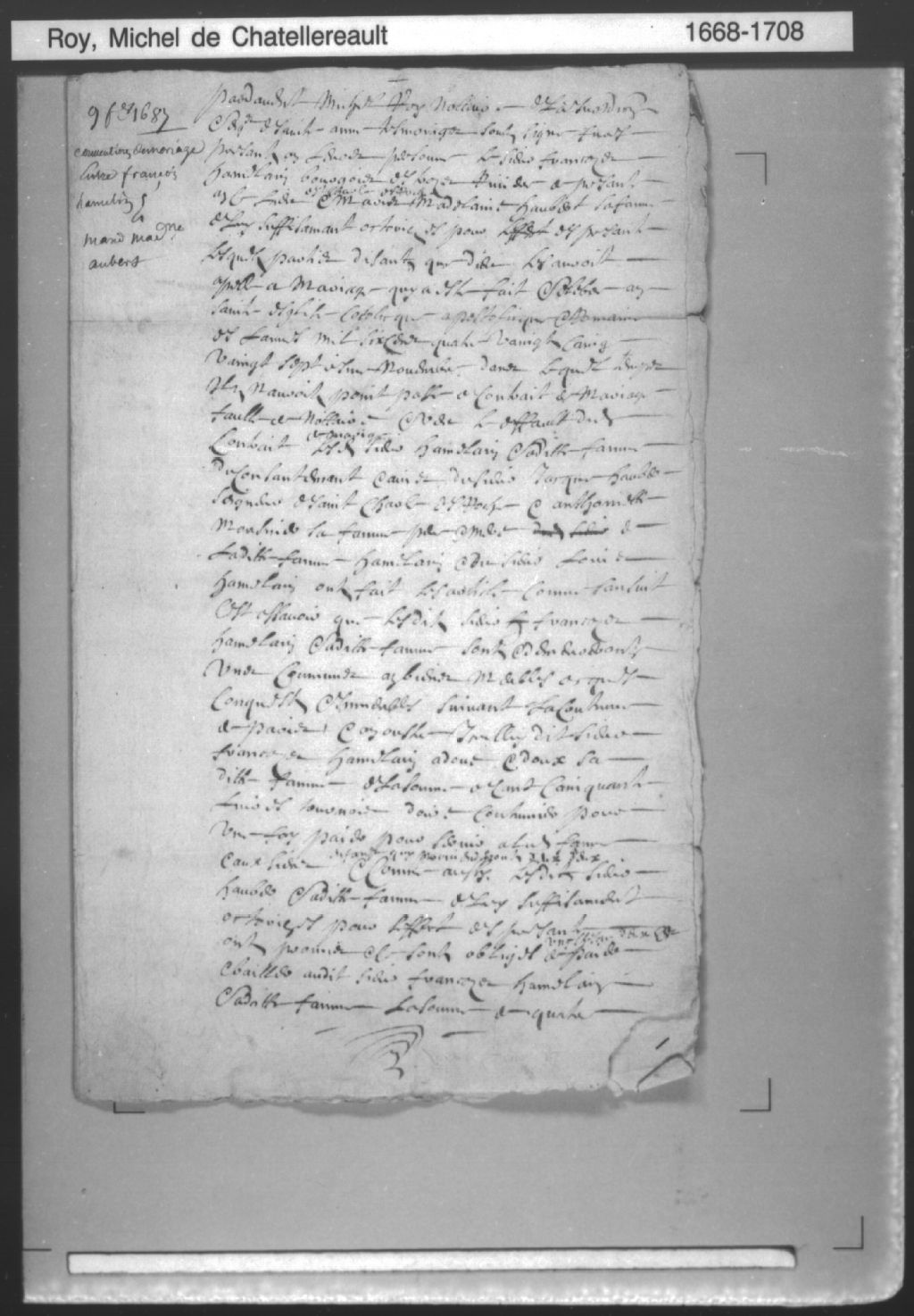 - Cette série regroupe 367 minutes notariales du greffe de Michel Roy de Châtellereault. Il n'y a aucune minute du 10 juin 1682 au 2 janvier 1687 inclusivement.De 1668 à 1708, le notaire Roy de Châtellereault a exercé à Sainte-Anne-de-la-Pérade (du 16 novembre 1668 au 8 mars 1708).Prises dans leur ensemble, les données colligées dans ces documents officiels à contenu administratif et légal peuvent constituer une source documentaire des plus révélatrices sur le mode et les conditions de vie de la population pendant cette période (métiers et professions mentionnés aux contrats, inventaires de biens, testaments), sur les classes sociales (mention de titres correspondant au rang social des parties concernées tels bourgeois, écuyer, etc), sur les moeurs et coutumes acceptées par la société et ses institutions (par le biais de déclarations, de jugement arbitral, d'injonctions, d'ordonnances, etc), et, dans une proportion moindre, sur la [...]
