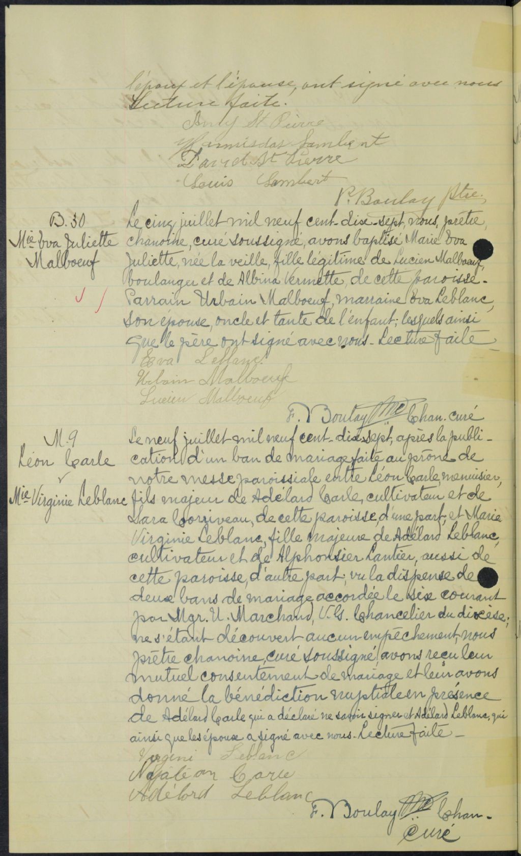 - Cette série regroupe les registres originaux de l'état civil, lesquels contiennent les enregistrements de baptêmes, de mariages et de sépultures consignés par le curé ou son représentant au cours de la période concernée par les documents.Outre les renseignements à caractère généalogique que nous pouvons y puiser, cette série peut constituer une source documentaire importante pour toute étude-statistique ou comparative sur les conditions de vie à différentes époques (mortalité infantile, espérance de vie) ou pour toute recherche portant sur l'occupation des terres (lieu de résidence), sur le mode de vie (métiers et professions, statut et âge des époux), sur les classes sociales (titres des parties impliquées, témoins/amis/parents présents lors d'un mariage), sur des évènements spéciaux (quelques mentions dans les sépultures) et sur des sujets à incidence médicale tels les maladies héréditaires (cause du décès)