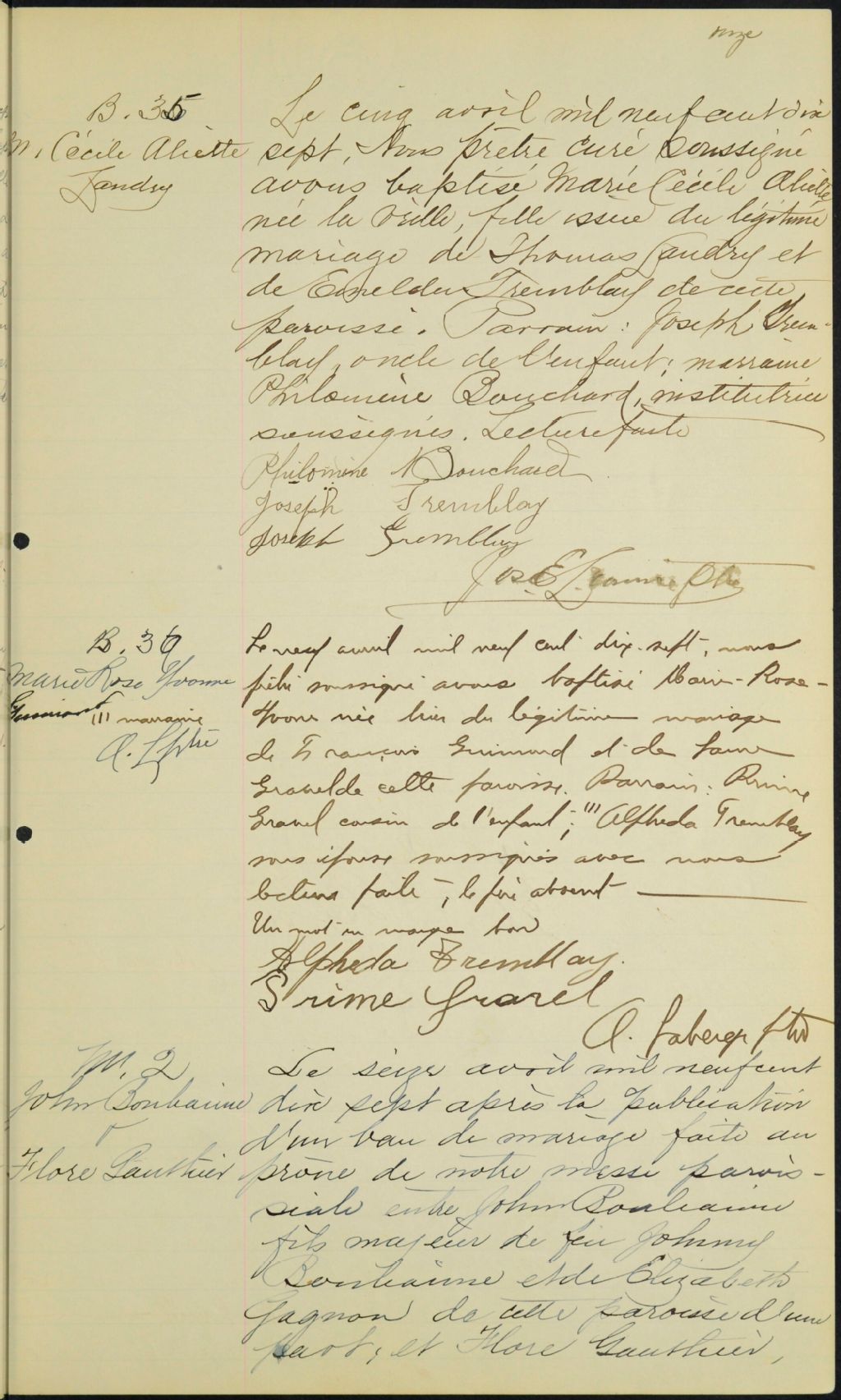 - Cette série regroupe les registres originaux de l'état civil, lesquels contiennent les enregistrements de baptêmes, de mariages et de sépultures consignés par le curé ou son représentant au cours de la période concernée par les documents. Pour la période 1860 à 1876 nous disposons également d'une copie sur bobines de microfilm, des registres conservés dans les paroisses. De plus, sur ces mêmes bobines sont inclus les registres de confirmations pour les années 1868 et 1874.Outre les renseignements à caractère généalogique que nous pouvons y puiser, cette série peut constituer une source documentaire importante pour toute étude-statistique ou comparative sur les conditions de vie à différentes époques (mortalité infantile, espérance de vie) ou pour toute recherche portant sur l'occupation des terres (lieu de résidence), sur le mode vie (métiers et professions, statut et âge des époux), sur les classes sociales (titres des parties impliquées, témoins/amis/parents présents lors du mariage), sur des événements spéciaux (quelques mentions dans les sépultures) et sur des sujets à incidence médicale tels les maladies héréditaires (cause du décès)
