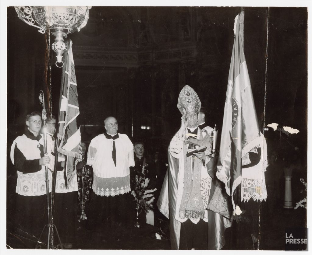Bénédiction de l'emblème de la police de Montréal, 1947, Archives nationales à Montréal, Fonds La Presse, (06M,P833,S3,D104), Photographe non identifié.