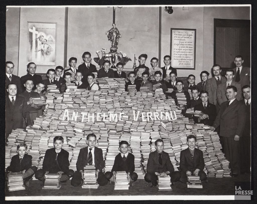 - Le dossier porte sur la campagne du livre français de la Commission des écoles catholiques de Montréal (CECM), sous la présidence de Me Pierre Laporte, ainsi que sur les Fêtes du centenaire de la CECM. On voit aussi Omer Côté, Joseph Dansereau et Mgr Philippe Perrier.