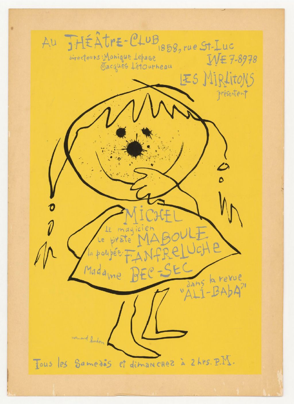 Les Mirlitons présentent Michel le magicien, le pirate Maboule, la poupée Fanfreluche, Madame Bec-sec dans la revue Ali-baba