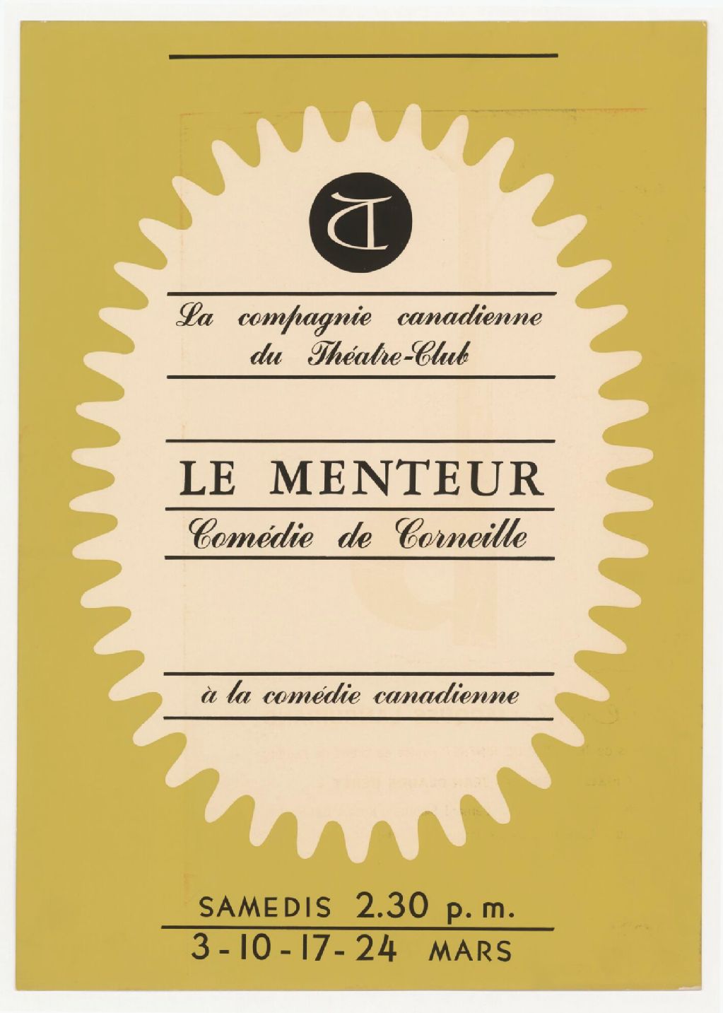 Le menteur, comédie de Corneille à la Comédie canadienne : samedis 2.30 p. m., 3 - 10 - 17 - 24 mars
