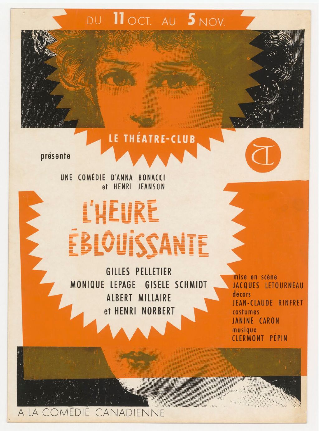 Du 11 oct. au 5 nov., le Théâtre-Club présente une comédie d'Anna Bonacci et Henri Jeanson, L'heure éblouissante : Gilles Pelletier, Monique Lepage, Gisèle Schmidt ... à la Comédie canadienne
