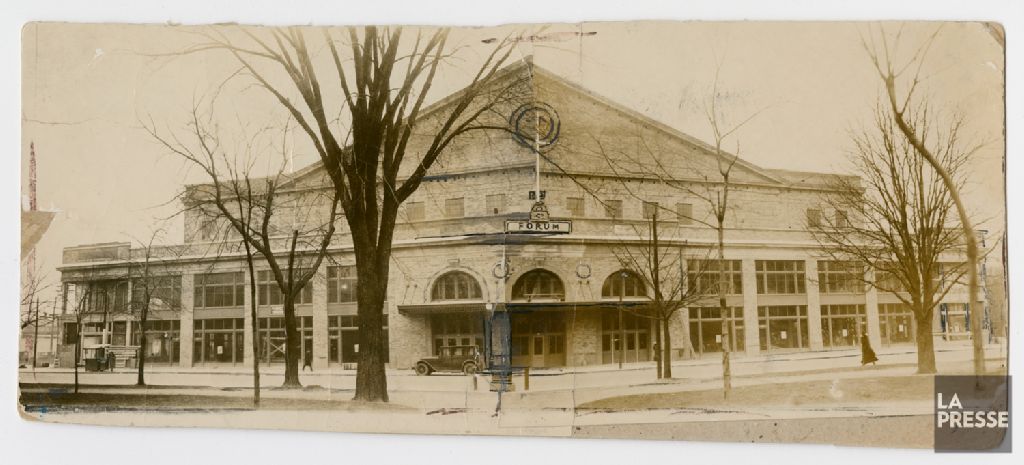 - Le dossier montre la façade et l¿intérieur du premier Forum de Montréal.