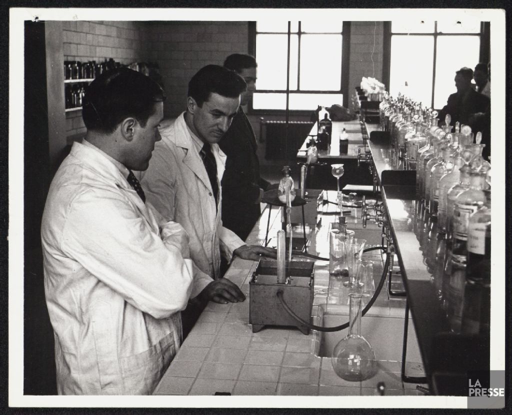 - Le dossier illustre plusieurs facultés de l'université : médecine, chirurgie dentaire, Institut de géologie, Institut neurologique, Institut de diététique et de nutrition, Institut de microbiologie et d'hygiène, Relations industrielles. Des documents montrent des élèves travaillant dans les laboratoires, notamment de physique, chimie, optométrie, pharmacie, nutrition et zoologie. Une photographie montre également le Dr Hans Selye dans un laboratoire de l'Institut de médecine et de chirurgie expérimentale.